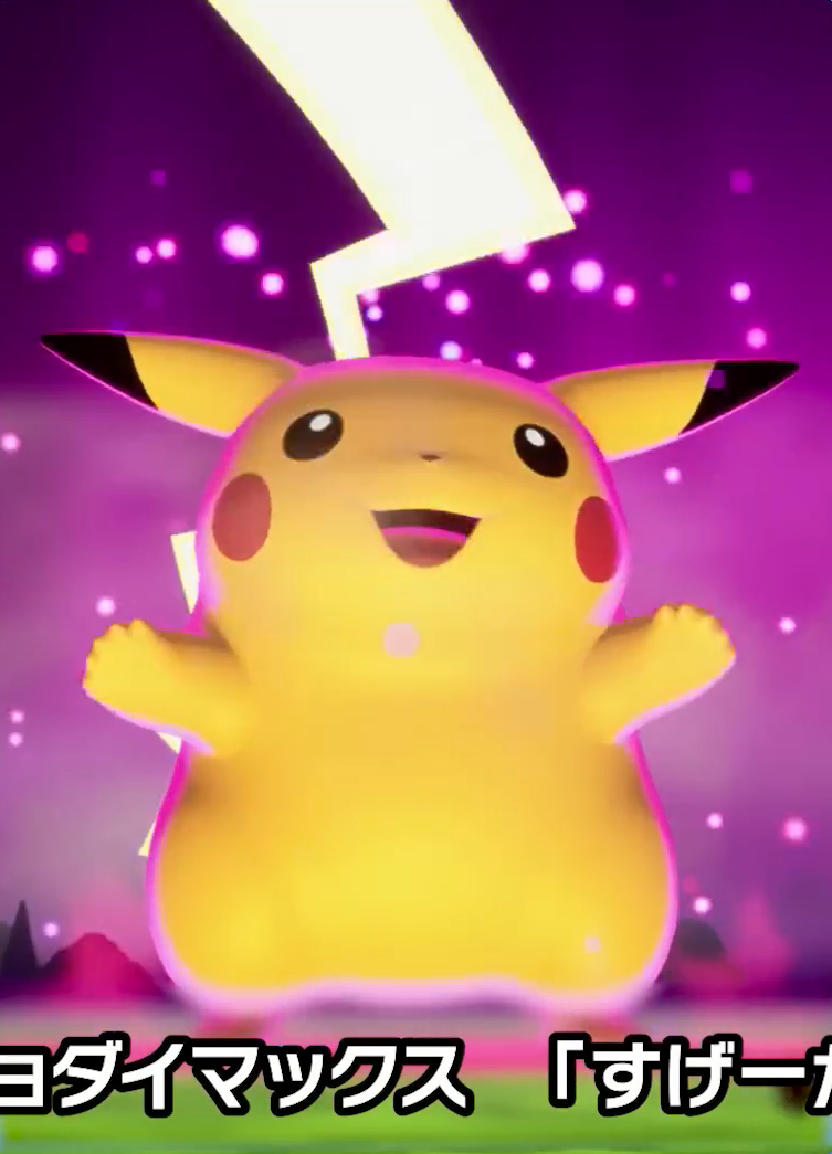 Seu poder Gigantamax expandiu, formando seu corpo superdimensionado e cauda imponente. Quando esmaga seus oponentes com sua cauda em forma de raio, produz uma onda de eletricidade equivalente a um relâmpago. Toda a eletricidade que produz nas bolsas que tem nas bochechas é armazenada na cauda. Em batalha, ataca os adversários com a sua cauda, atravessando-os com raio elétrico tão poderoso como um relâmpago! Tornou-se tão poderoso que agora consegue produzir tanta eletricidade como uma central elétrica! No entanto, parece difícil utilizar esta eletricidade para abastecer casas, uma vez que o Pikachu apenas consegue ficar na forma Gigantamax por pouco tempo.