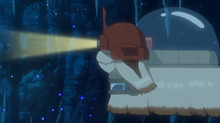 *Durante uma viagem subaquática, Komondomon ergue uma barreira para proteger os passageiros às suas costas*